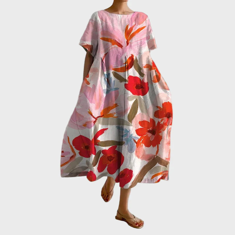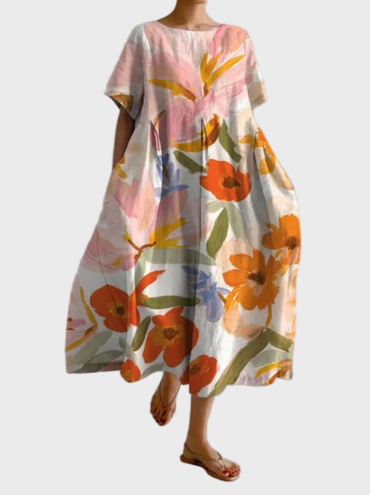The Blooming Canvas is a dress that resembles a work of art, bursting with colours and vibrancy. The bold floral strokes in orange, pink, yellow, and blue create a stunning look that exudes freshness and femininity.