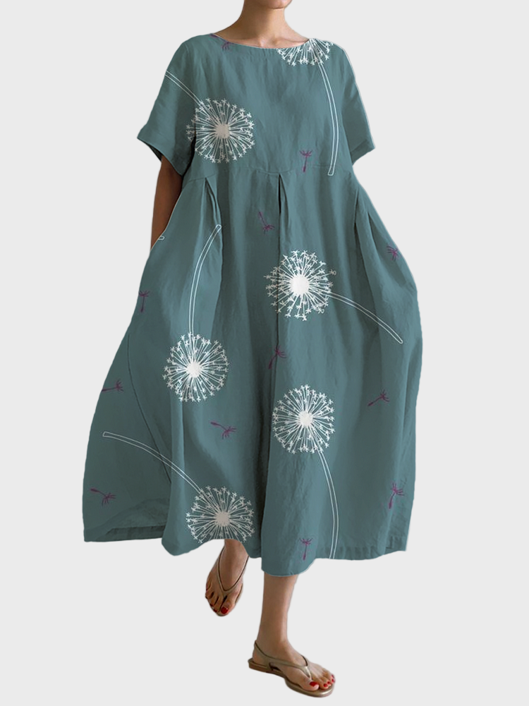 The Dandelion Whispers is a unique dress that exudes romance and carefree spirit. The white dandelions on the blue-green fabric create a sense of calm and freshness, perfect for stylish and comfortable summer outings.