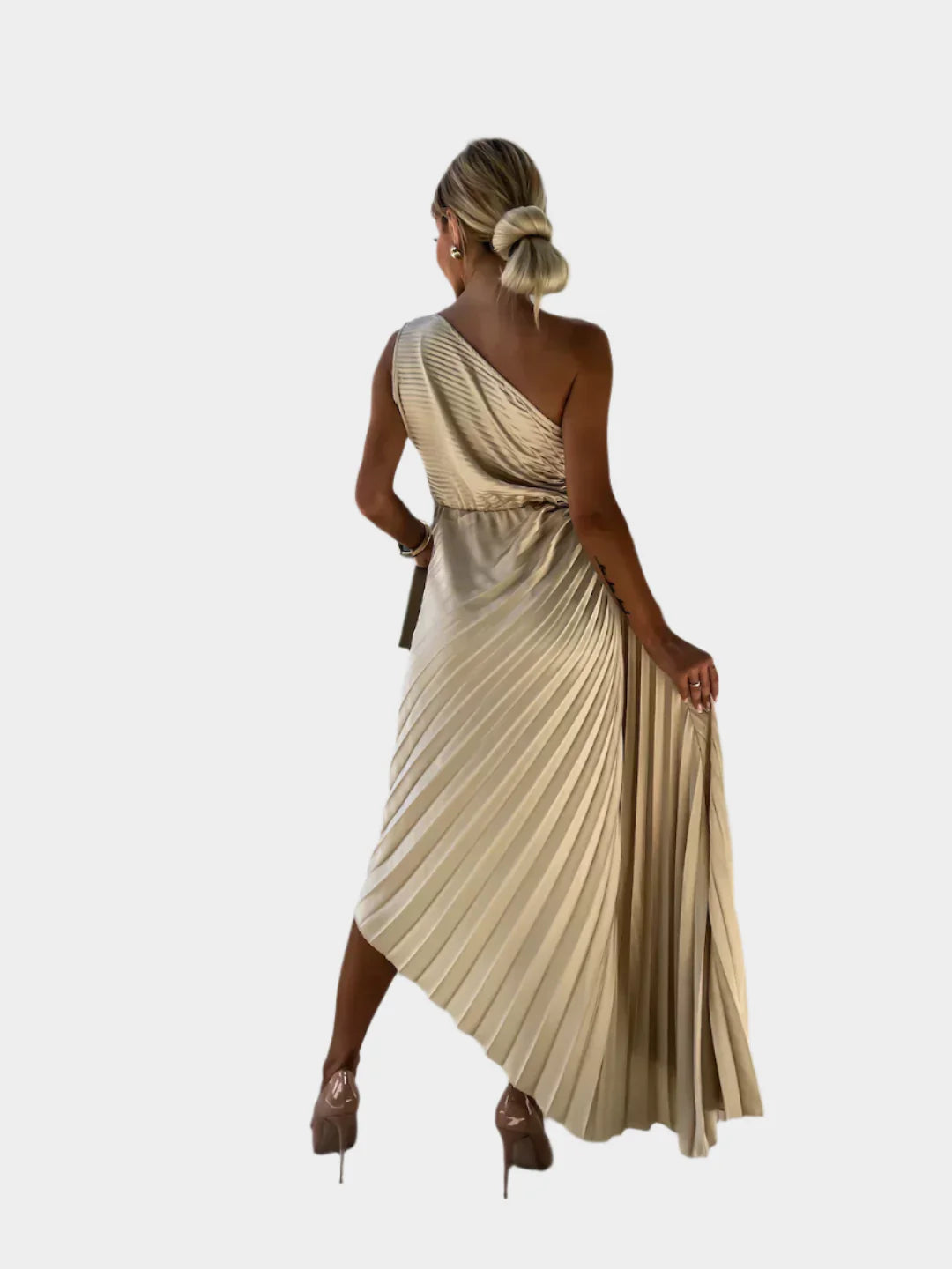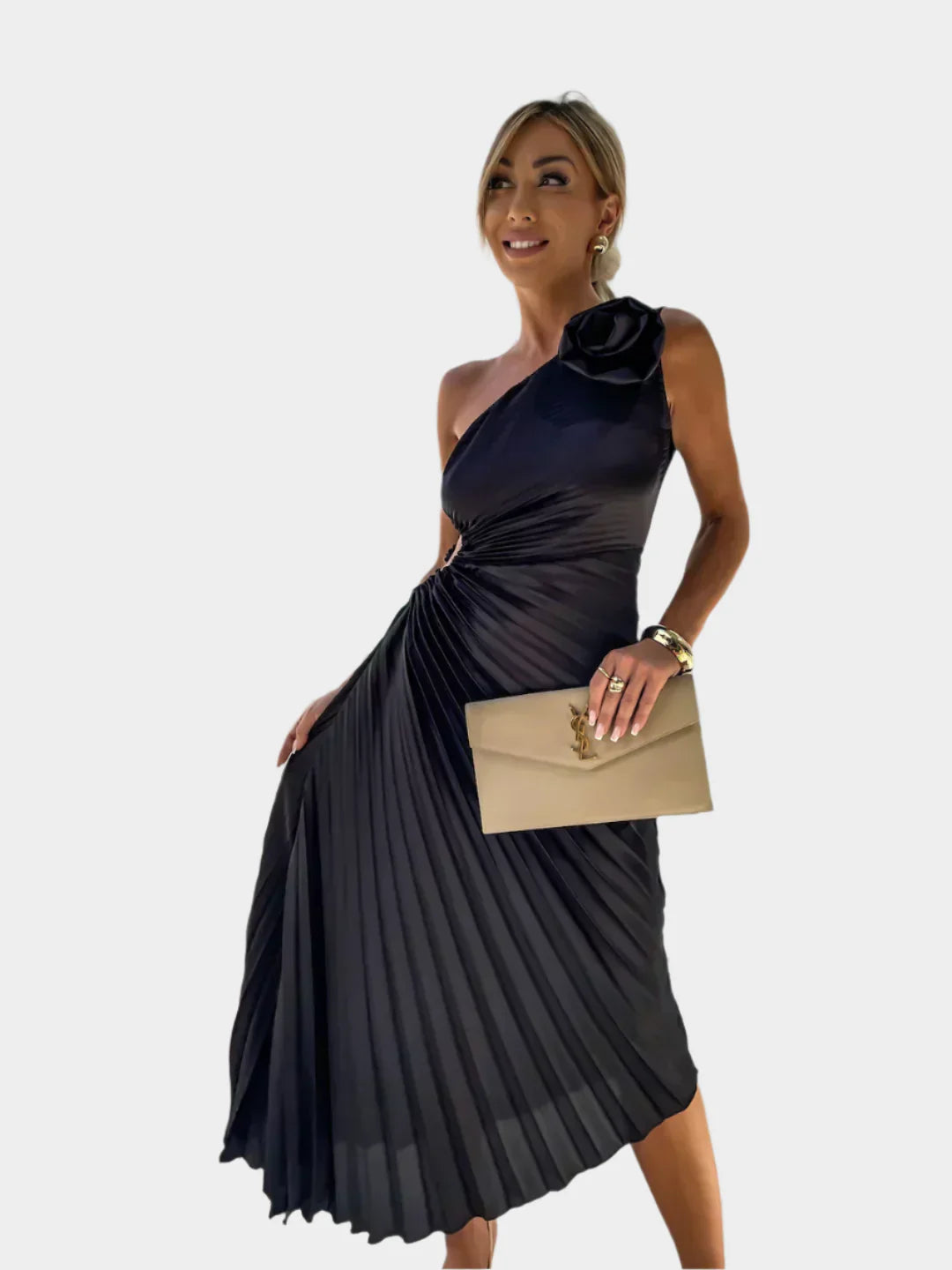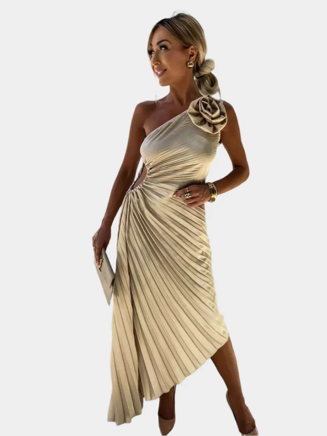 It is a statement of style and grace. With its asymmetrical line, pleated skirt, and three-dimensional floral detail, it is the perfect choice for weddings, evening events, or elegant summer dinners. The lightweight fabric caresses the silhouette in a refined manner.