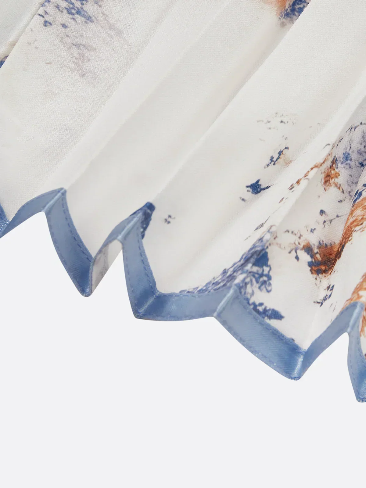 It is the epitome of feminine elegance. With a deep neckline, light pleated texture, and subtle floral pattern, it offers airy movement and aristocratic style. The delicate blue belt at the waist accentuates the silhouette, adding elegance to every step.
