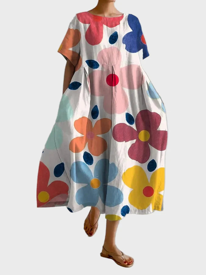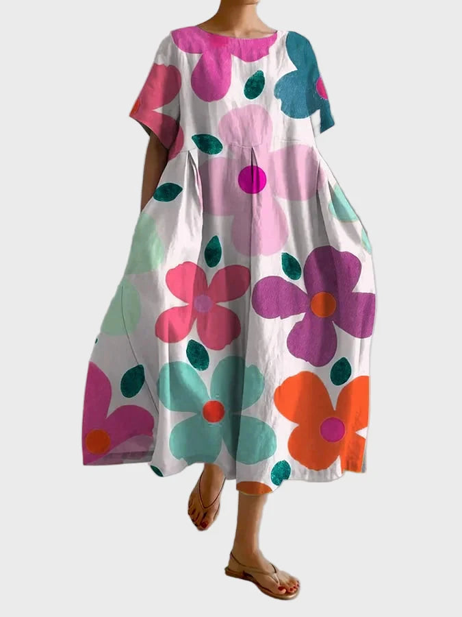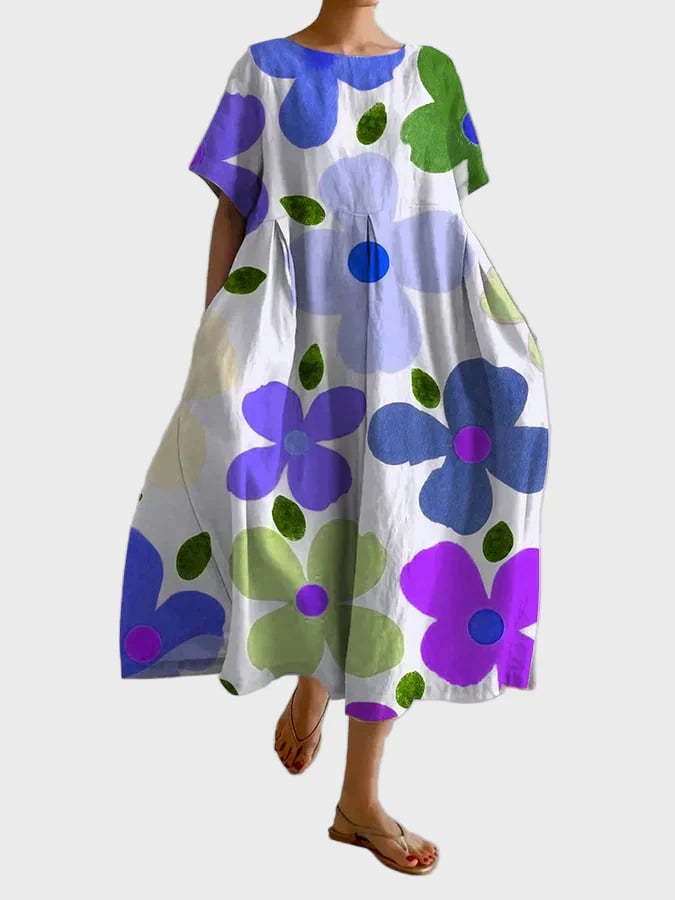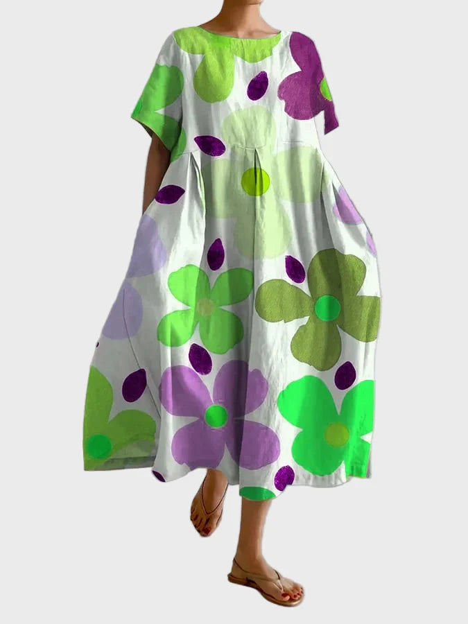 Add colour and vibrancy to your summer with this maxi dress featuring oversized flowers in shades of green, lilac, and purple. The lightweight fabric and relaxed fit make it perfect for everyday wear, beaches, and stylish, comfortable strolls.