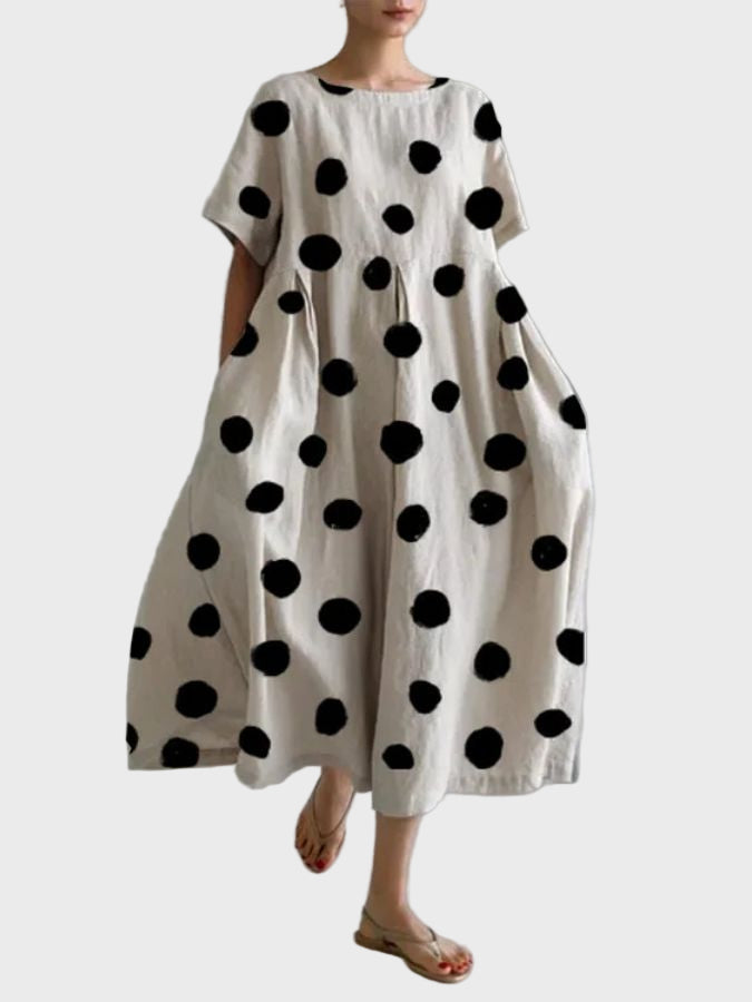 The Polka Dot Charm is a dress that combines classic elegance with a playful spirit. The bold black polka dot details on a white background create a timeless design suitable for any occasion.